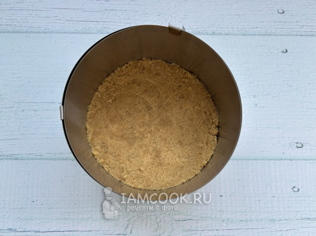 Тщательно смешайте масло с крошкой печенья. Распределите получившуюся массу равномерно по дну разъемной формы диаметром около 18-20 см, плотно прижимая пальцами или используя стакан. Поставьте основание в морозилку на 15-20 минут, пока будете готовить начинку.