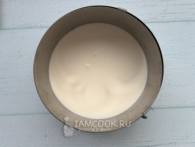 Достаньте из морозилки готовую основу и вылейте сливочно-творожную массу поверх нее ровным слоем. Оставьте чизкейк в холодильнике на 1-2 часа или больше, чтобы он стабилизировался и стал плотнее.