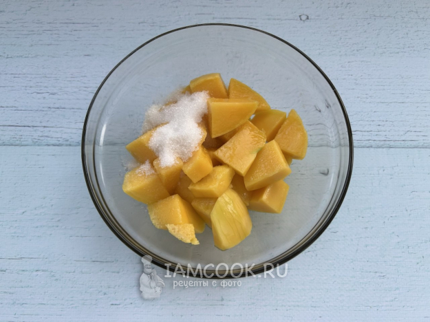 Очистите манго от кожуры и косточки, нарежьте мякоть на средние кусочки и добавьте сахар.