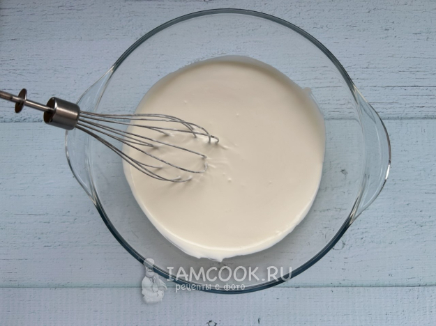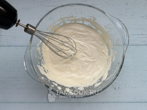 Пока желатин набухает, взбейте жирные сливки с сахаром и ванилином до мягких пиков.