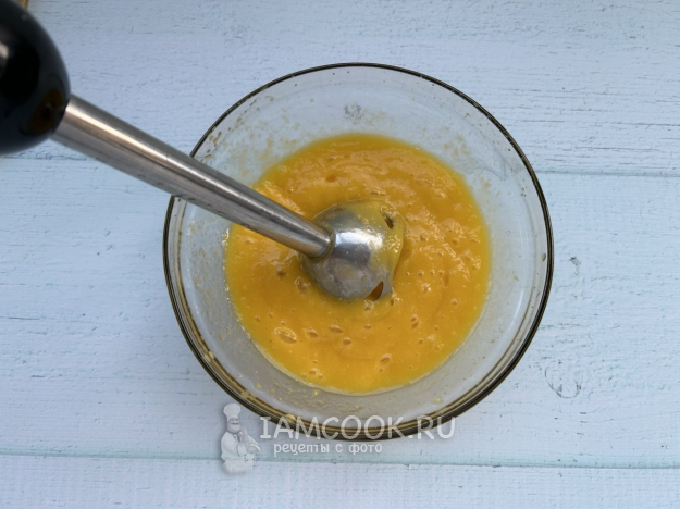 Пробейте манго блендером до состояния пюре. Замочите 5 граммов желатина в воде согласно инструкции на упаковке. Когда желатин набухнет, нагрейте его на водяной бане или в микроволновке до растворения гранул, постоянно помешивая. Остудите до комнатной температуры, добавьте его в манговое пюре и хорошо перемешайте.