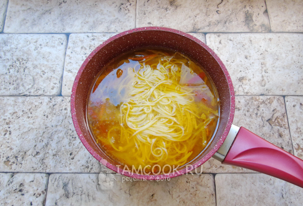 За 1-2 минуты до окончания приготовления супа выложите спагетти, налейте соевый соус и перемешайте с остальными ингредиентами.
