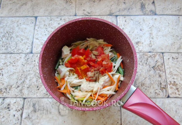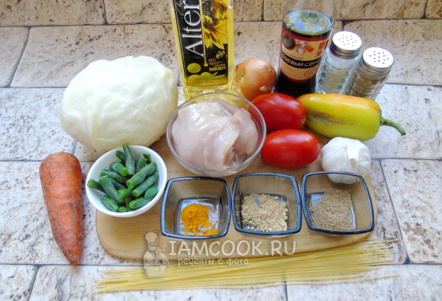 Белокочанную капусту, морковь и болгарский перец нарежьте соломкой. Выложите в кастрюлю, добавьте стручковую фасоль. Жарьте овощи 5-6 минут.