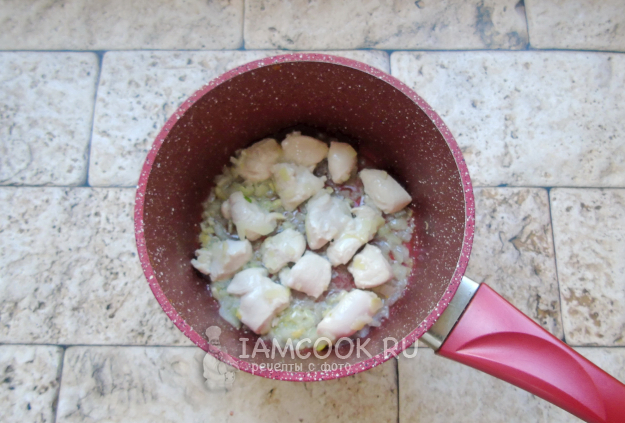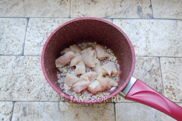 Куриное филе нарежьте небольшими кусочками и добавьте в кастрюлю.
