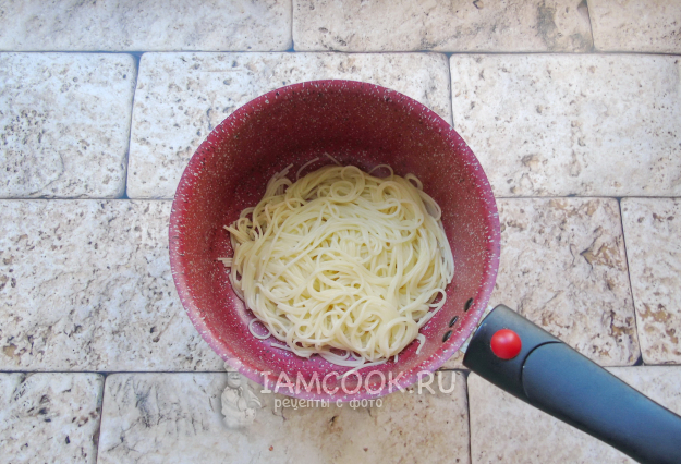 Тем временем сварите спагетти. Выложите в кипящую подсоленную воду и варите согласно инструкции на упаковке. У меня очень тонкие, и были готовы через 5 минут. После откиньте спагетти на дуршлаг.