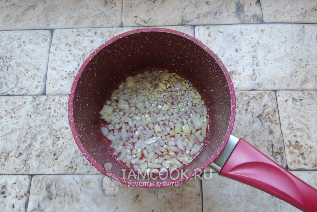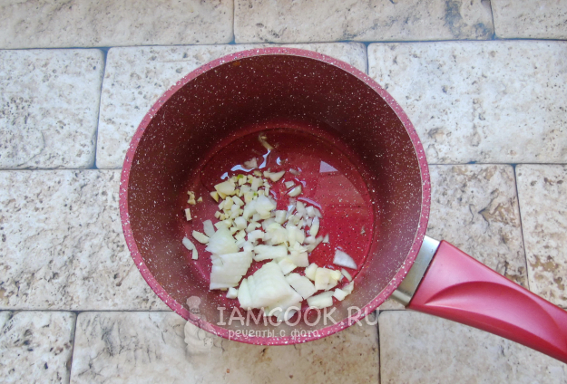 Чеснок и лук мелко нарежьте и выложите в кастрюлю, желательно с толстым дном. Налейте растительное масло.