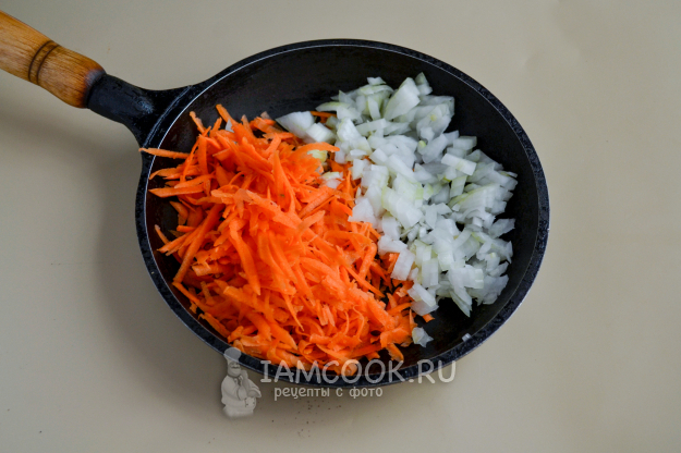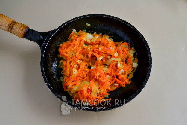 Параллельно с варкой булгура разогрейте сковороду с растительным маслом, положите натертую на крупной терке морковь и мелко нарезанный лук.