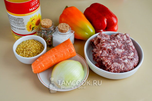 Соберите продукты для приготовления перцев, фаршированных фаршем и булгуром. Лук, перцы и морковь вымойте. Морковь и лук очистите.