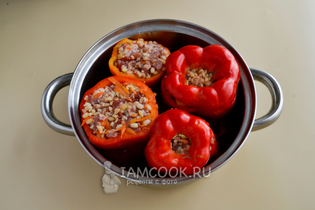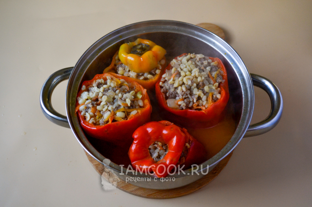 Поставьте фаршированные перцы. По желанию перцы можно прикрыть срезанными верхушками-крышечками. Влейте в кастрюлю горячую воду и поставьте на огонь.