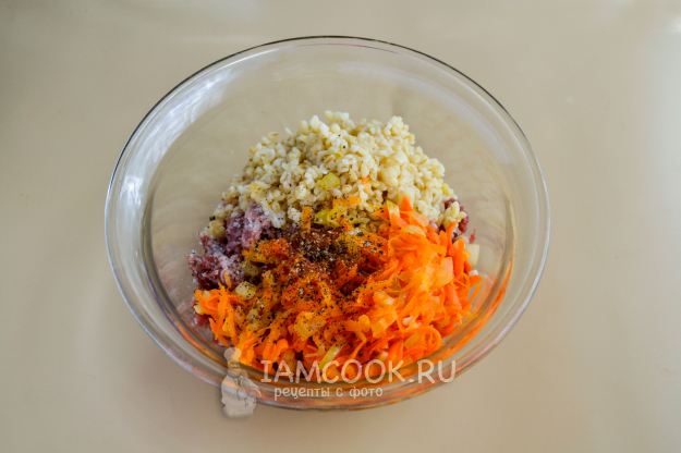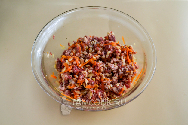 В миску положите фарш, готовый булгур, половину обжаренной моркови с луком. Посолите и поперчите.