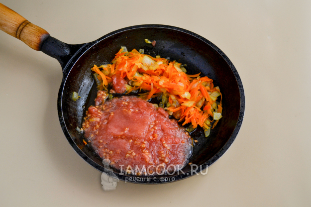 На сковороду с оставшимися овощами положите либо томатную пасту, либо измельченный помидор. Перемешайте, обжарьте 4-5 минут.