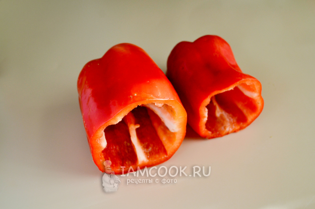 Срежьте с перцев верхушки. Удалите семена. Промойте перцы изнутри.