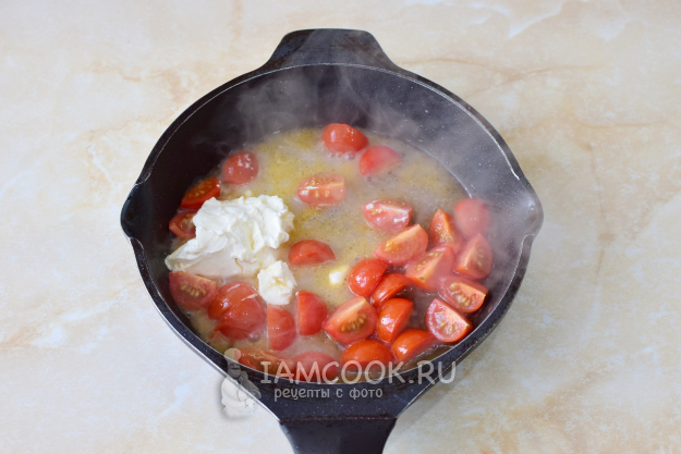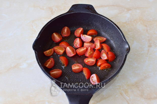 На горячую сковороду налейте немного растительного масла. Выложите нарезанные помидоры и обжарьте их в течение минуты.