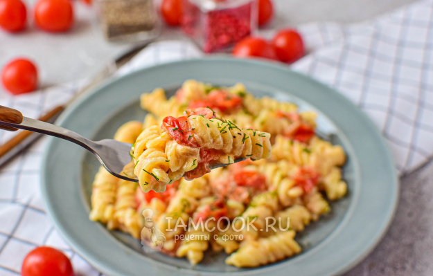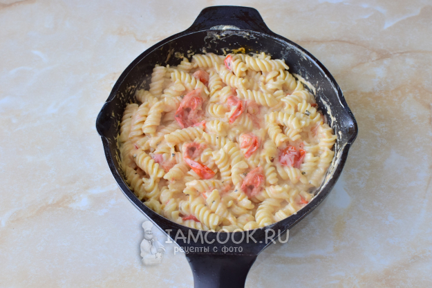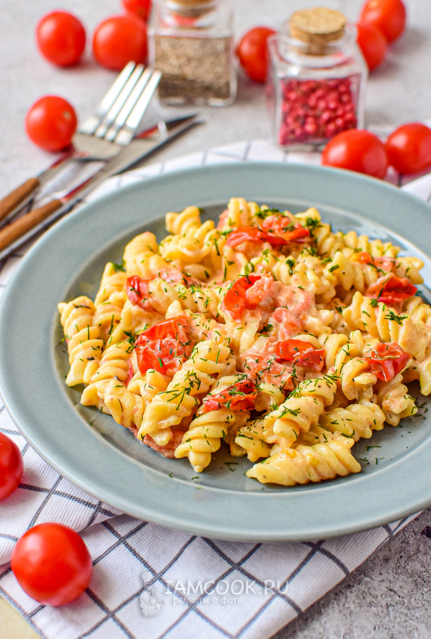 Паста с маскарпоне и помидорами готова. Разложите на тарелки и подавайте к столу. Приятного аппетита!