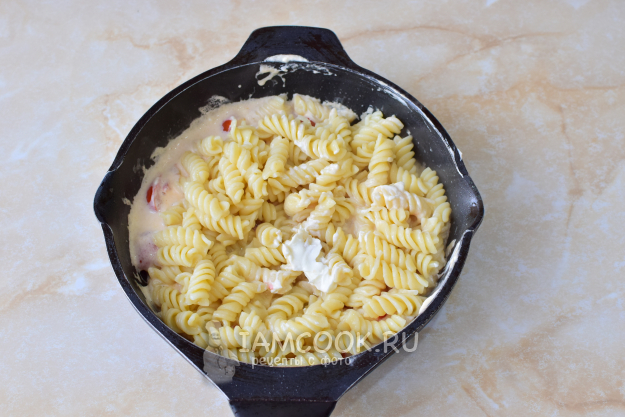 Выложите в сковороду пасту. Все перемешайте. По вкусу добавьте соль и специи.
