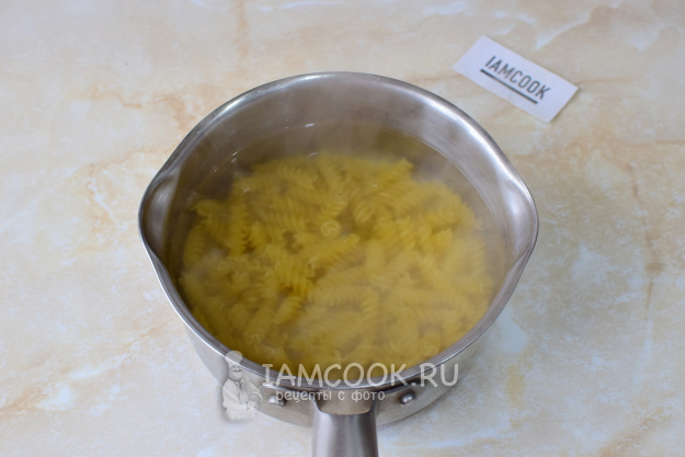 Первым делом необходимо отварить пасту. Отварите её в кипящей воде согласно инструкции на упаковке, на это уйдет примерно 12-15 минут.