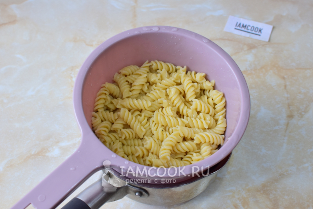 Готовую пасту откиньте на дуршлаг и пролейте холодной водой.