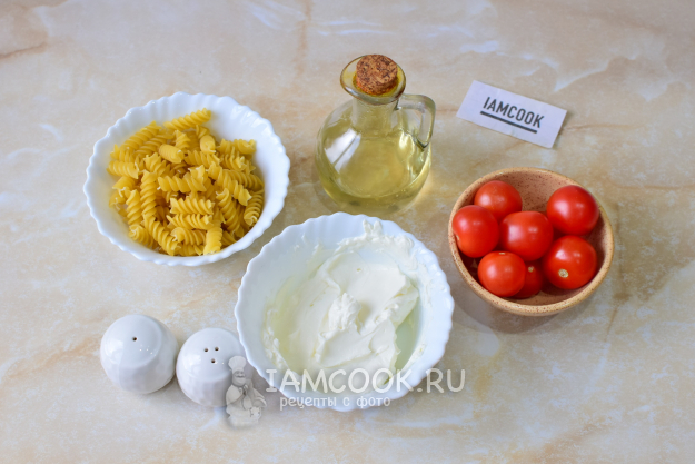 Чтобы сделать пасту с маскарпоне и помидорами, подготовьте необходимые ингредиенты по списку. Можно взять любой вид пасты. Помидоры можно взять любые - черри или обычные.