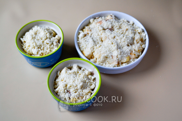 Сверху распределите оставшуюся крошку слоем так, чтобы яблоки были ей полностью покрыты.