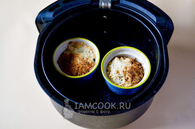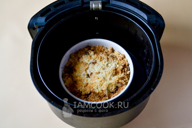 Поставьте формочки в чашу аэрогриля и запекайте яблочный крамбл при температуре 180°С примерно 15 минут.