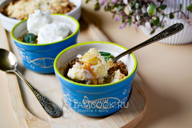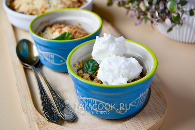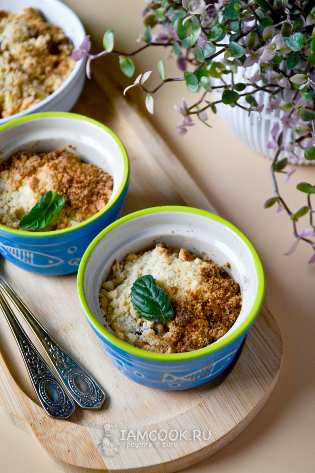 Можно приготовить крамбл в одной большой форме. Верх крамбла должен хорошо зарумяниться, а яблоки - стать мягкими, почти кремовыми.