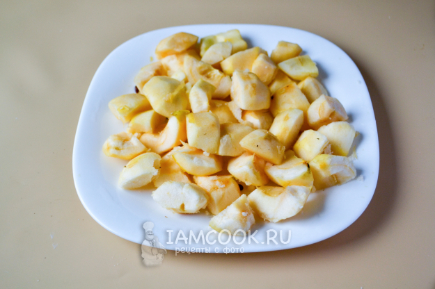 Яблоки вымойте, очистите от кожуры, вырежьте семенную камеру и нарежьте на кусочки.