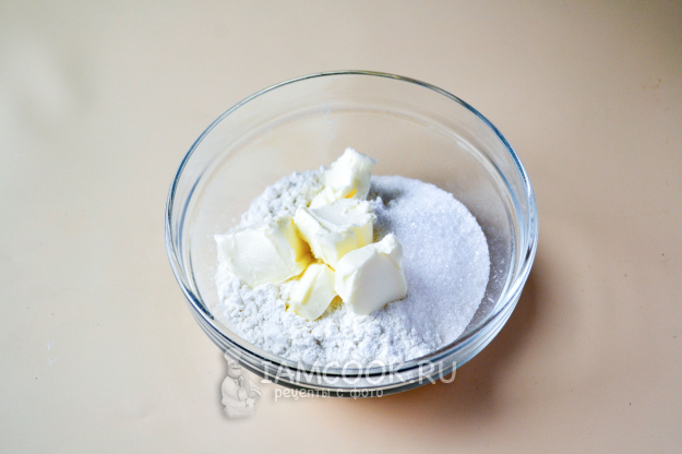 В миску насыпьте муку, добавьте сахар и сливочное масло.