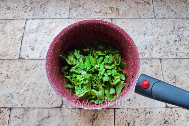 Щавель помойте, обрежьте стебли. Листья нарежьте произвольно и выложите в кастрюлю с небольшим количеством воды.