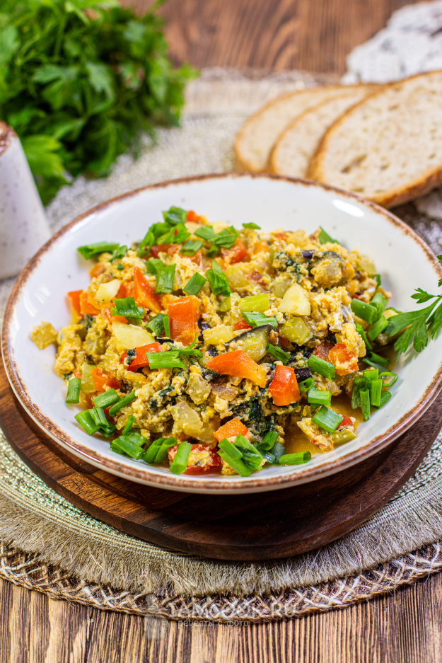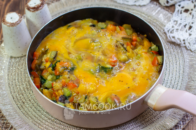 Залейте в сковороду яйца. Перемешивайте овощи, чтобы яйца равномерно распределилось в рагу. Когда яйца свернутся, можно снимать сковороду с плиты. Подавать тушеные овощи с яйцом горячими как основное блюдо или холодными как закуску. Приятного аппетита!