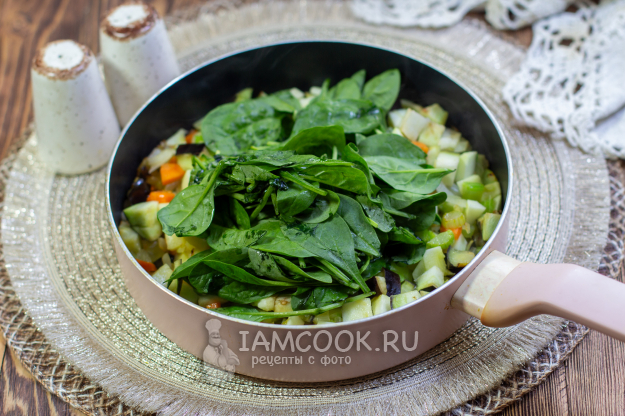 Свежий шпинат добавьте к овощам, перемешайте и готовьте 1-2 минуты. Свежий шпинат можно заменить на замороженный.