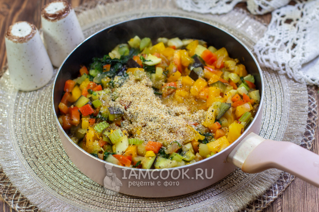 К овощам добавьте соль, молотый черный перец и любимые специи. Я добавила немного молотого чеснока и чуть-чуть молотого кориандра. Перемешайте овощи со специями.