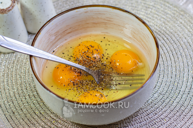В подходящую посуду вбейте куриные яйца, слегка посолите и поперчите. Размешайте их вилкой.
