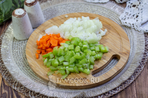 Лук, морковь и стебель сельдерея помойте, очистите и нарежьте мелким кубиком. В сковороде с высокими бортиками нагрейте растительное масло и отправьте туда овощи. Готовьте овощи при среднем нагреве, периодически помешивая, несколько минут.