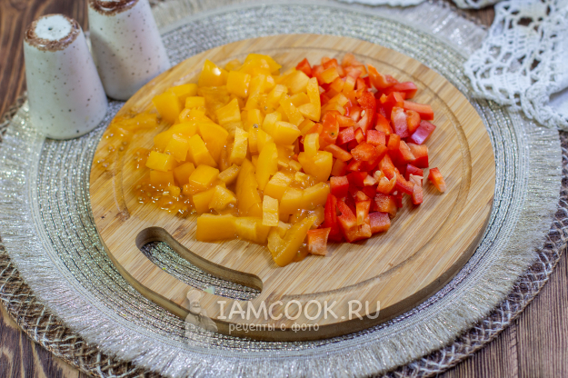 Свежий помидор и сладкий перец также нарежьте небольшим кубиком. Добавьте в сковороду и готовьте вместе еще несколько минут.