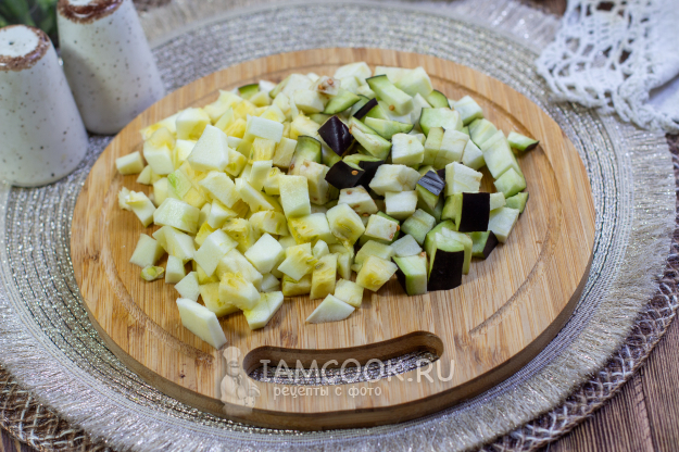 Кабачок и баклажан тоже нарежьте небольшими кубиками и добавьте их в сковороду. Готовьте еще 3-4 минуты, помешивая.