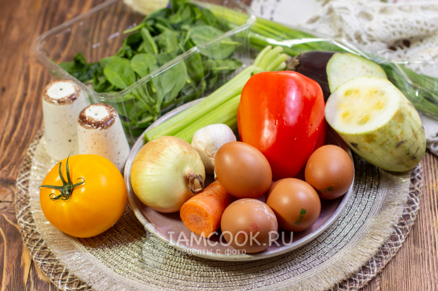 Соберите необходимые продукты для приготовления тушеных овощей с яйцом на сковороде. Я взяла сезонные овощи, которые были в наличии у меня дома. Примерно на 3-4 порции вам понадобится немного свежих овощей и 4-5 яиц. По желанию готовое блюдо можно посыпать тертым сыром.