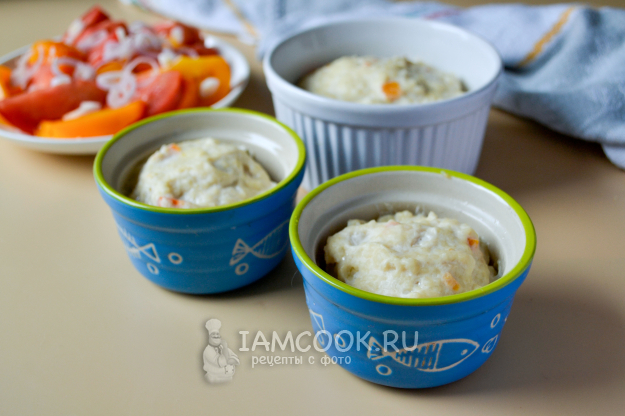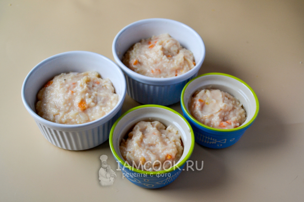 Подходящие небольшие формочки смажьте растительным или сливочным маслом и заполните подготовленным фаршем. Запеканку можно сделать в одной большой форме.