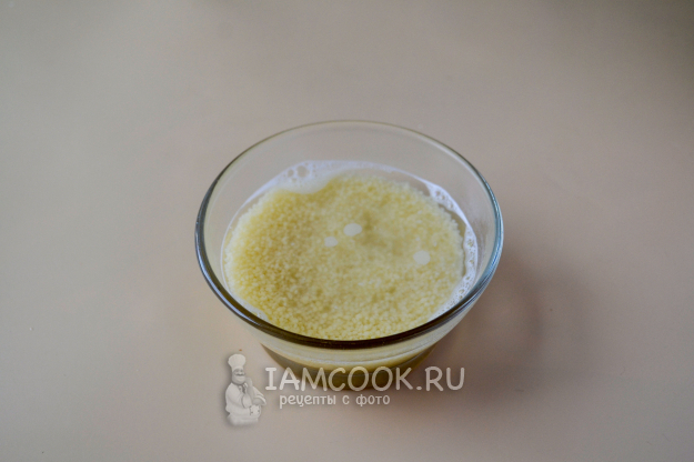 Кускус залейте кипящей водой. Накройте мисочку крышкой и оставьте на время, пока будете готовить фарш. Крупа за это время впитает воду и набухнет.