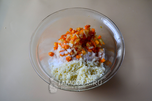 В миску положите фарш, овощи со сковороды, набухший кускус. Посолите.