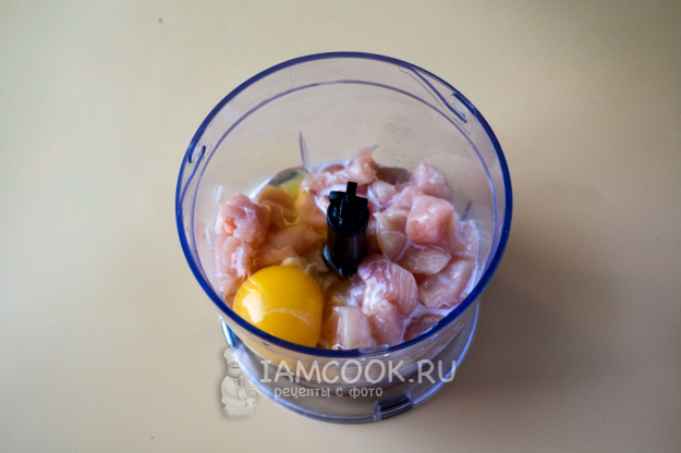 Куриную грудку нарежьте кусочками, положите в чашу измельчителя. Вбейте яйцо, влейте молоко.