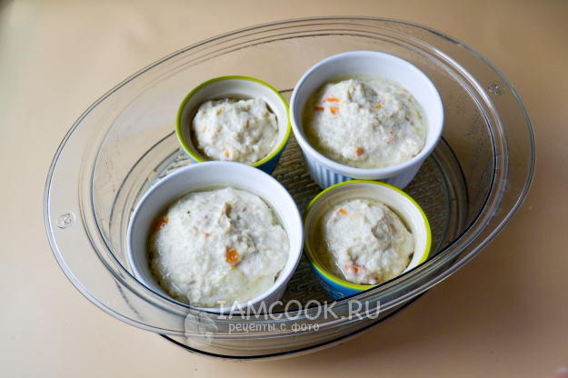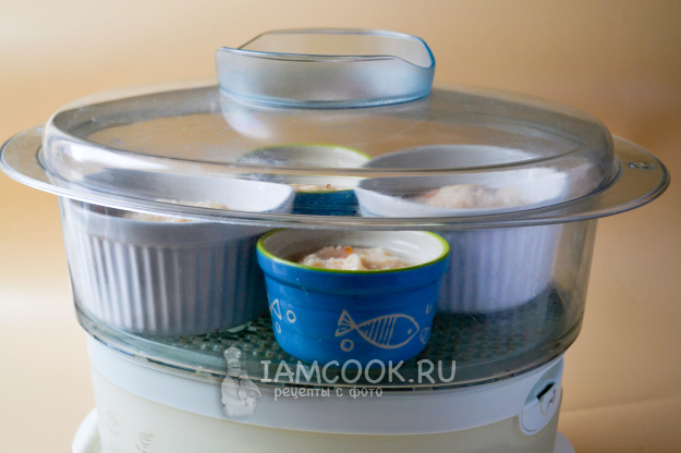 В пароварку налейте горячую воду, на поддон установите формочки с фаршем, закройте крышкой и установите время приготовления 30 минут.