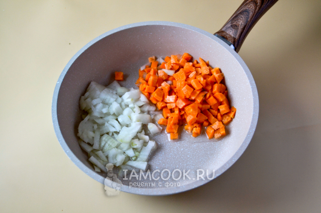 Морковь нарежьте мелким кубиком, лук мелко нарежьте. Положите овощи на разогретую с растительным маслом сковороду.