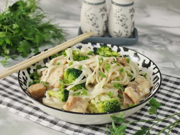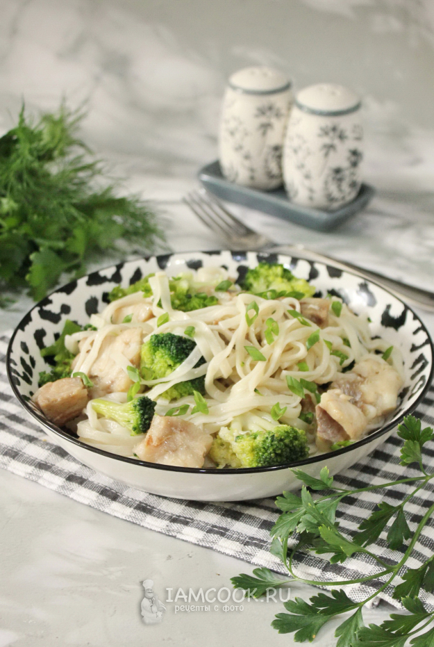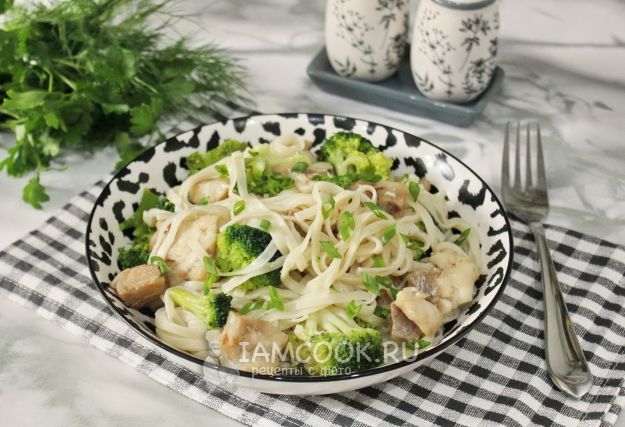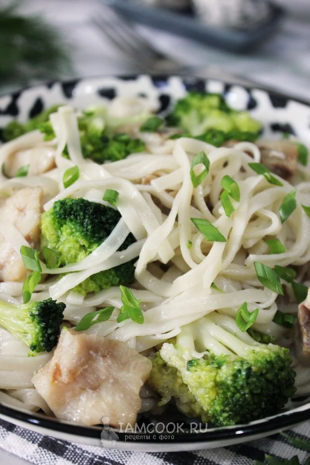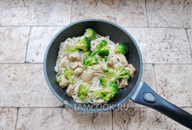 В сковороду с жареной рыбой выложите лапшу удон и брокколи. Перемешайте эти ингредиенты и прогрейте 2 минуты.