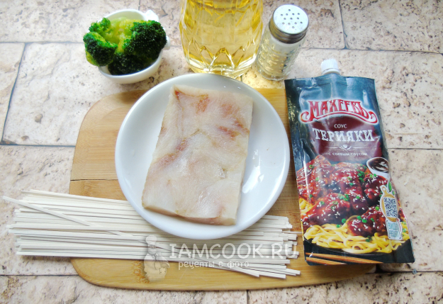 Соберите ингредиенты для приготовления лапши удон с рыбой.