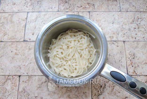 В кипящую подсоленную воду отправьте лапшу удон и варите согласно инструкции на упаковке. Удон варится очень быстро. Затем откиньте лапшу на дуршлаг.