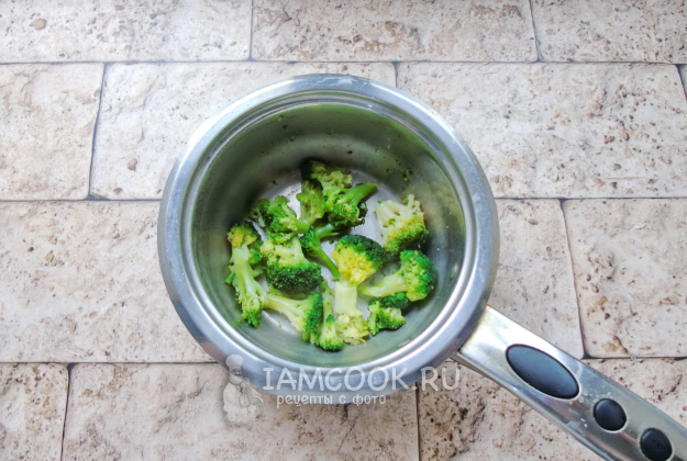 А тем временем в кастрюлю с кипящей подсоленной водой выложите брокколи и варите 4-5 минут. Затем откиньте на дуршлаг и воду слейте.