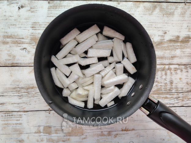 Овощечисткой снять с овоща кожицу, мякоть нарезать брусочками.