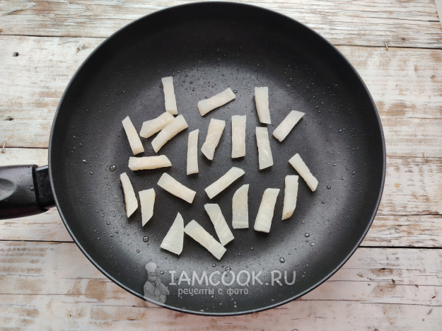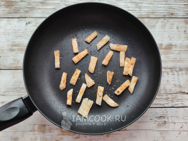 Откинуть вареные брусочки на дуршлаг, чтобы лишняя жидкость стекла. Такая манипуляция избавит от разбрызгивания масла на сковороде при выкладывании на нее овоща. На сковороде разогреть масло, убавить огонь до среднего. Выложить овощную соломку на сковороду. Обжарить до легкого румянца с одной стороны.