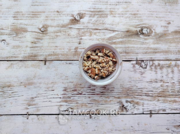 Тем временем подготовить грецкие орехи, освободить ядра от скорлупы, прокатать их в пакете скалкой, чтобы получилась дробленая крошка (пыль не нужна, поэтому кофемолкой не следует пользоваться).