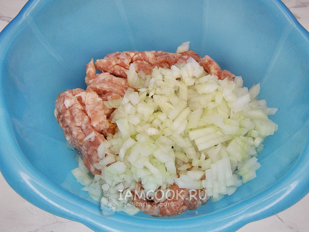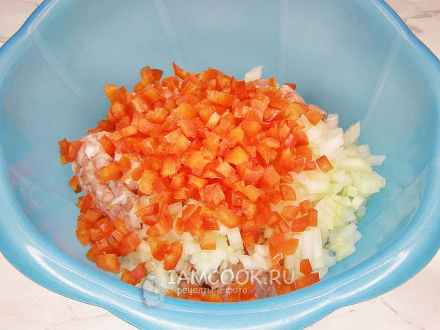Из болгарского перца удаляем семена и нарезаем его маленькими кубиками. Добавляем в миску с фаршем и луком.